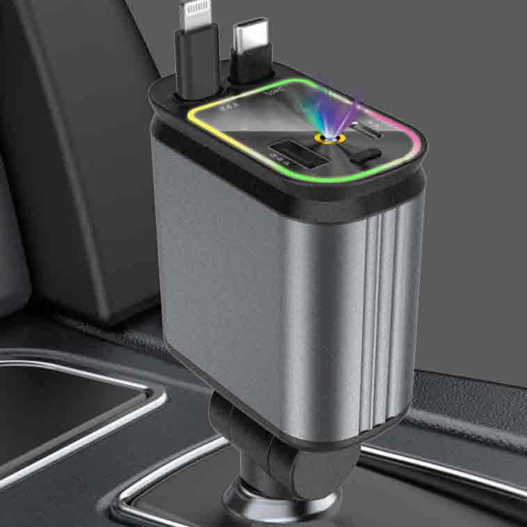 Power up multiple devices on the go with this 4-in-1 Car Mobile Phone Charger, designed for convenience, organization, and style. Featuring dual retractable cables and additional charging ports, it allows you to charge several devices at once without messy wires cluttering your car.